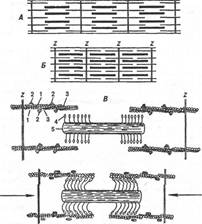 А — розслаблена і Б — скорочена міофібрила; В — механізм скорочення саркомера; 1 — акти-нова нитка; 2 — тропонін; 3 — тропоміозин; 4 — голівка поперечного місточка міозинової нитки; 5 — міозинова нитка; Z — мембрана; стрілки вказують напрямок ковзання ниток актину вздовж міозинових ниток до середини саркомера Концентрація йонів кальцію в цитоплазмі м'язового волокна зменшується, комплекс тропонін—кальцій розпадається і відновлюється початкова форма тропоніну, характерна для м'яза в стані спокою. Тропоміозин виходить з жолобків між актиновими нитками і знову блокує процес прикріплення голівок місточків міозинової нитки до нитки актину. Голівки місточків міозинової нитки від'єднуються і відпускають актинову нитку.