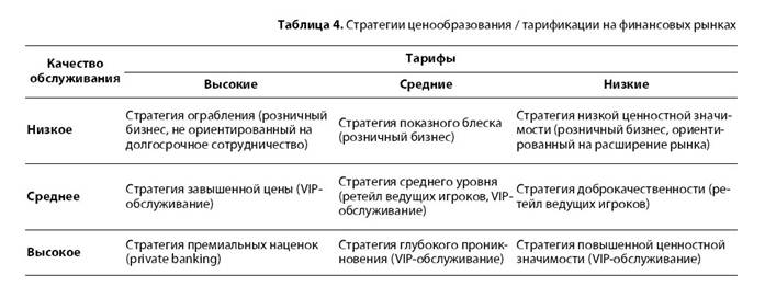 Повышение лояльности: § создание позитивного имиджа банка § бонусные программы (ценовое и неценовое стимулирование) § повышение финансовой грамотности § пакетирование банковских услуг § private banking, предлагающий индивидуальное комплексное обслуживание Матрица ценообразования для банковского сектора помогает учитывать критерии качества обслуживания (возможность предоставления дополнительного сервиса) и тарифы на предоставляемые услуги (табл. 4). Такой подход способствует введению стандартных пакетов услуг, ориентированных на различные сегменты в соответствии со стратегией развития банка.