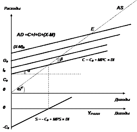 Рис. 41. Функции импорта, экспорта и чистого экспорта Графическое представление функции совокупных затрат основано на кейнсианской модели «доходы – расходы». Эта модель построена на допущении о фиксированных или жестких ценах. Смысл модели основан на свойстве биссектрисы угла, которая указывает все точки, в которых экономика может оказаться в состоянии равновесия. Последовательное добавление к функции потребления автономных инвестиций, автономных государственных затрат и автономного чистого экспорта и даст равновесное значение ВВП (точка пересечения биссектрисы первого координатного угла и функции совокупных затрат). На графике S – это функция сбережений, (- С0) – автономные сбережения, mps – предельная склонность к сбережению. Равновесное значение ВВП (YРАВН соответствует точке Е) можно определить по формуле: ВВПРАВН = А / (1 – МРС) = А / МРS, где А – величина автономных расходов. А = C0 + I0 + G0 + (X – М)0.