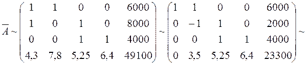 Три судна доставили в порт 6000 т чугуна, 4000 т железной руды и 3000 т апатитов. Разгрузку можно производить как непосредственно в железнодорожные вагоны для последующей доставки потребителям, так и на портовые склады. В вагоны можно разгрузить 8000 т, а остаток груза придется направить на склады. Необходимо учесть, что поданные в порт вагоны не приспособлены для перевозки апатитов. Стоимость выгрузки 1 т в вагоны составляет соответственно 4,30, 5,25 и 2,20 ден. ед. Записать в математической форме условия полной разгрузки судов, если затраты на нее должны составить 58850 ден. ед. Решение. По условию задачи, доставленные в порт чугун, железную руду и апатиты можно разгрузить двумя способами: либо в железнодорожные вагоны, либо в портовые склады. Обозначим через x i j количество груза (в тоннах) i-го вида (i= 1,2,3), которое предполагается разгрузить j-м способом (j = 1, 2). Таким образом, задача содержит шесть неизвестных. Условие полной разгрузки чугуна можно записать в виде x 11 + x 12 = 6000, (10.1) где x 11, x 12 - части чугуна, разгружаемого соответственно в вагоны и на склады. Аналогичное условие должно выполняться и для железной руды: x21 + x22 = 4000. (10.2) Что же касается апатитов, то их можно разгружать только на склады, а поэтому неизвестное x 31 = 0, и условие полной разгрузки апатитов принимает вид x 32 =3000. (10.3) Условие полной загрузки всех поданных в порт вагонов запишется так: x 11 + x 21 = 8000. (10.4) Затраты на разгрузку, по условию, определены в 58850 ден. ед., что можно выразить записью: 4,3x 11 + 7,8 x 12 + 5,25 x 21 + 6,4x 22 + 3,25x 32 = 58850. (10.5) Итак, с учетом сложившейся в порту ситуации условия полной разгрузки судов выражаются в математической форме системой линейных уравнений (10.1) - (10.5). С учетом (10.3) уравнение (10.5) перепишется в виде: 4,3x 11 + 7,8x 12 +5,25x 21 +6,4x 22 = 49100, и теперь мы имеем систему из четырех уравнений с четырьмя неизвестными x 11, x 12, x 21, x 22, расширенная матрица которой имеет вид: