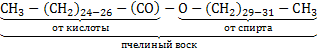 Если R1 – остаток пальмитиновой кислоты (C15H31COOH), R2 – остаток стеариновой кислоты (С17H35COOH), R3 – остаток алииновой кислоты (C8H17CH=CHC7H14COOH), то тогда такой жир называется α-пальметил-β-стеарил-α1-алиил-глицерин. Высшие жирные кислоты содержат, как правило, четное число атомов углерода (12-18). Это связано с тем, что биосинтез этих жирных кислот строится из двууглеродных фрагментов. Воска представляют собой сложные эфиры длиноцепных карбоновых кислот и также длиноцепных спиртов. Поскольку воска представляют собой обычно смеси веществ, то они не имеют постоянной температуры плавления и при нагревании расмягчаются медленно, как все аморфные вещества. Аналогичными свойствами обладают парафины.