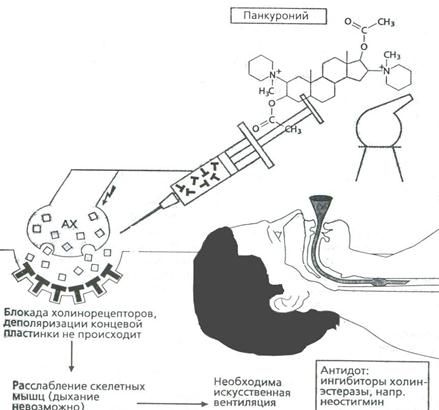 Рис.5. Механизм действия миорелаксантов. Показания к применению: 1. Анестезиология: интубация трахеи, эндоскопические процедуры (дитилин, диоксоний). 2. Репозиция костей при переломе, вправление вывихов (векурония бромид, панкурония бромид). 3. Лечение столбняка, судорожных состояний (алкурония хлорид, дитилин). 4. Обездвиживание глазного яблока (дитилин).