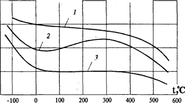 1 – модуль упругости; 2 – временное сопротивление; 3 – предел текучести Рис.2.2.2. Механические свойства низкоуглеродистой стали при изменении температуры
