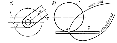 Обратимость КП Низшие пары обладают свойством обратимости, т. е. вид траекторий точек звеньев при их относительном движении одинаков (траектории точек А и В одинаковые окружности см рис. а). Высшие пары этим свойством не обладают даже при чистом качении. Так, траектория точки А цилиндра 1 (см. рис. б) при его качении по звену 2— циклоида, а при качении звена 2 по цилиндру 1 — эвольвента. Уравнения и свойства этих кривых различны.