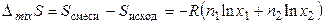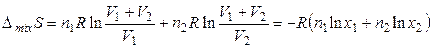Следует обратить внимание, что энтропия газа при Т = const изменяется, если только изменяется его парциальное давление. Уравнение для расчета энтропии смешения можно также легко получить как сумму изменений энтропий каждого газа при их изотермическом расширении до объема смеси: