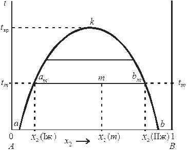 Рис. 8.9. Диаграмма состояния системы ограниченно смешивающихся жидкостей с верхней критической температурой растворения. На рассматриваемой диаграмме кривая akb, называемая кривой расслоения (ликвации), разделяет области существования гетерогенных (под кривой расслоения) и гомогенных (над кривой расслоения) систем. Составы равновесных жидких фаз находятся по правилу соединительной прямой: фигуративные точки, изображающие состав всей системы и составы отдельных равновесных фаз, лежат на одной прямой, называемой нодой. Так, например, система состава x 2(m), изображенная на диаграмме точкой m, при температуре tm распадается на две равновесные фазы am и bm составов x 2(Iж) и x 2(IIж). Характерной особенностью расслаивающихся систем является то, что в гетерогенной области при заданной температуре с изменением состава всей системы составы отдельных фаз остаются постоянными, меняется только их количественное соотношение (определяется по правилу рычага). Повышение температуры ведет к увеличению взаимной растворимости жидкостей (составы жидких фаз сближаются), так что при некоторой температуре достигается полная взаимная растворимость жидкостей: например при t кр = 168 оС для системы вода – анилин и при t кр = 65,8 оС для системы фенол – вода (критические температуры растворения). 2). Системы с нижней критической температурой растворения (триэтиламин – вода, 2,4,6‑триметилпиридин – вода). Повышение температуры в таких системах приводит к уменьшению взаимной растворимости жидкостей. При температурах ниже критической температуры растворения наблюдается полная взаимная растворимость жидкостей, выше – система расслаивается. 3). Системы с верхней и нижней критическими температурами растворения (вода – никотин). Между двумя критическими температурами существует область, в которой система гетерогенна. Например, для системы никотин – вода критические температуры растворения равны 208 оС и 61 оС. 8.13.2. Равновесие «пар – жидкий раствор» в системах с ограниченной взаимной растворимостью жидкостей. Если система образована из двух летучих ограниченно смешивающихся жидкостей, то пар над такой системой будет содержать оба компонента и находиться в равновесии либо с одной (гомогенная область), либо с каждой из жидких фаз (гетерогенная область). Однако если в гетерогенной системе две фазы порознь находятся в равновесии с третьей фазой, то они равновесны и между собой. Тогда