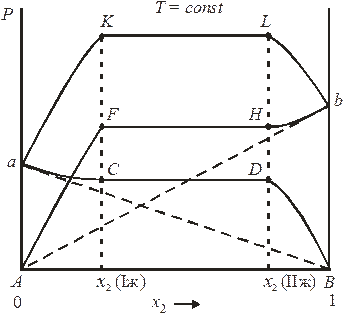 Рис. 8.10. Зависимость общего и парциальных давлений пара от состава системы в случае ограниченной взаимной растворимости жидкостей при T = const, если область составов от x 2(Iж) до x 2(IIж) – область расслоения; кривая aB – P 1 = f (x) по закону Рауля; кривая Аb – P 2 = f (x) по закону Рауля; кривая аCDB – P 1 = f (x) в системе; кривая АFHb – P 2 = f (x) в системе; кривая aKLb – P = f (x) – зависимость общего давления пара от состава. 8.14. Равновесие «пар – жидкость»