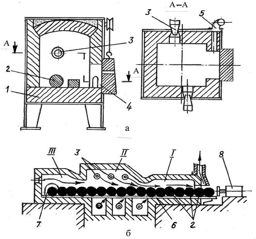 Рис. 1.34 - Нагревательные печи: а - камерная; б - методическая Электропечи сопротивления. Конструктивно они такие же, как и пламенные, но в качестве нагревателей используют металлические или карборундовые (силитовые) элементы сопротивления, подключающиеся к силовой электрической сети. Сопротивления, нагреваясь, излучают теплоту, которая передается стенкам печи и заготовкам, находящимся на поду. Явным преимуществом таких печей является возможность точного регулирования температуры рабочего пространства. Однако при температурах, необходимых для нагрева стали, стойкость элементов сопротивления низка. Поэтому используют их в основном для нагрева под обработку давлением цветных сплавов. Индукционное электронагревательное устройство, рис. 1.35,а. Заготовку 1 помещают внутрь многовиткового соленоида (индуктора) 2, выполненного из медной трубки. По индуктору пропускают переменный ток, и в заготовке, оказывающейся в переменном электромагнитном поле, возникают вихревые токи, под действием которых и происходит разогрев заготовки. Преимущества индукционного нагрева: высокая скорость, в несколько раз превышающая скорость нагрева в печах; почти полное отсутствие окалины и обезуглероживания; возможность повышения температуры начала ОМД без появления перегрева; удобство автоматизации подачи и выдачи заготовок; улучшение условий труда. К недостаткам следует отнести: меньшую универсальность, т. к. для заготовок разных размеров нужно применять разные индукторы; высокую стоимость электроустановок и электроэнергии. Поэтому индукционный нагрев применяют в цехах крупносерийного производства поковок. Устройство электроконтактного нагрева, рис.1.35,б. В устройствах концы заготовки 1 зажимают между медными контактами 3, к которым подводится ток большой силы. При прохождении тока через заготовку в ней, из-за ее электрического сопротивления, выделяется теплота, пропорциональная квадрату силы тока. Контактный нагрев обладает теми же достоинствами, что и индукционный.