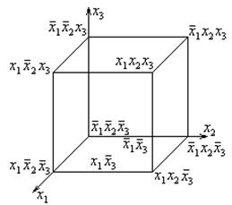 Каждый геометрический элемент меньшей размерности покрывается геометрическими элементами большей размерности. Каждая конъюнкция большего ранга покрывается всеми конъюнкциями меньшего ранга. Геометрические эквиваленты называют интервалами. Интервал L-го ранга – подмножество вершин куба, соответствующих конъюнкции ранга L. Например: Kонъюнкции x соответствует 4 вершины: 100, 101, 110, 111. На кубе отмечают вершины, где формула алгебры логики равна 1. Эти вершины образуют подмножество Т1. Для того, чтобы задать ДНФ на кубе, необходимо задать покрытие всех вершин.