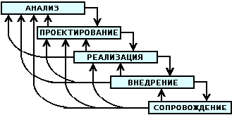При описании жизненного цикла системы используются следующие понятия: · Процесс - цепочка последовательно выполняемых работ; · Этапы – последовательные отрезки времени, в течении которого выполняются работы. Модель жизненного цикла (ЖЦ) программного обеспечения информационной системы (ПО ИС) при автоматизированном проектировании ИС играет достаточно важную роль. Это обусловлено тем, что каждая из CASE-систем, ориентирована на (поддерживает) определенную модель ЖЦ ПО ИС. Жизненный цикл ПО ИС представляет собой непрерывный процесс, начинающийся с момента принятия решения о создании ПО и заканчивающийся при завершении его эксплуатации. Основным нормативным документом, регламентирующим ЖЦ ПО, является международный стандарт ISO/IEC 12207 (ISO-Международная организация по стандартизации IEС международная комиссия по электротехнике). В нём определяется структура ЖЦ, содержащая процессы, действия и задачи, которые должны быть выполнены при создании ПО. Модель жизненного цикла - это структура, определяющая последовательность выполнения и взаимосвязи процессов, действий и задач на протяжении ЖЦ. Наибольшее распространение получили следующие модели ЖЦ ПО: каскадная, с промежуточным контролем и спиральная. Модели каскадная и с промежуточным контролем включают следующие этапы жизненного цикла ПО: анализ, проектирование, реализация, внедрение и сопровождение. Каскадная модель (водопад) Каскадная модель (в 70-80-е годы) предусматривает последовательную организацию работ. При этом основной особенностью является разбиение всей разработки на этапы, причем переход с одного этапа на следующий происходит только после полного окончания работ по предыдущему этапу. Каждый этап завершается выпуском полного комплекта документации. Достоинствами такой модели являются: формирование на каждом этапе законченного комплекта документации и возможность планирования сроков завершения работ и соответствующих затрат. Недостатком модели является её несоответствие реальному процессу создания ПО, который обычно не укладывается в жесткую схему и требует возврата к предыдущим этапам для уточнения или пересмотра принятых решений. Каскадная модель (или «водопад») применяется при создании однородных ИС, для которых приложение – единое целое, поскольку в этом случае можно достаточно точно и полно сформулировать требования к будущей системе. К однородным системам относятся сложные расчетные системы и системы реального времени.