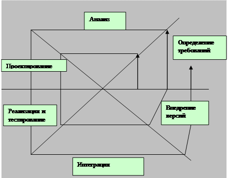Рис. 1 Каскадная модель. Схема разработки ПО Модель с промежуточным контролем (в 80-85-е годы) приближает ЖЦ к реальному процессу создания и применения ПО. В отличие от каскадной модели, она допускает возврат с каждого этапа жизненного цикла на любой предыдущий этап для выполнения межэтапной корректировки. При этом обеспечивается большая надежность ПО, но вместе с тем увеличивается длительность периода разработки. · Рис. 2 Каскадная схема с промежуточным контролем Спиральная модель (в 86-90-е годы)- Спиральная модель предполагает итерационный процесс разработки информационной системы. Итерация – повторение. При этом делается упор на начальные этапы ЖЦ - анализ и проектирование. Реализуемость технических решений проверяется на этих этапах путем создания прототипов. Прототип – формирование информационного объекта, как некоторой действующей модели. Каждая итерация представляет собой законченный цикл разработки, приводящий к выпуску внутренней или внешней версии изделия, которое совершенствуется от итерации к итерации, чтобы стать законченной системой. Каждый виток спирали соответствует созданию фрагмента или версии Программного изделия, на нем уточняются цели и характеристики проекта, определяется его качество и планируются работы следующего витка спирали. На каждой итерации углубляются и последовательно конкретизируются детали проекта, в результате чего выбирается обоснованный вариант, который доводится до окончательной реализации. Использование спиральной модели позволяет осуществлять переход на следующий этап выполнения проекта, не дожидаясь полного завершения работы на текущем – недоделанную работу можно будет выполнить на следующей итерации. Главная задача каждой итерации – как можно быстрее создать работоспособный продукт, который можно показать пользователям системы. Таким образом, упрощается процесс внесения уточнений и дополнений в проект. Основная проблема спирального цикла - определение момента перехода на следующий этап. Для ее решения необходимо ввести временные ограничения на каждый из этапов жизненного цикла. Переход с этапа на этап осуществляется в соответствии с планом, даже если не вся запланированная работа закончена. План составляется на основе статистических данных, полученных в предыдущих проектах, и личного опыта разработчиков Рис Спиральная модель жизненного цикла.