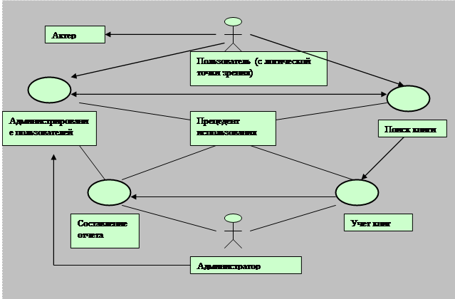 Чтобы получить более наглядное представление, приведем ряд диаграмм UML. Рассмотрим пример, в котором описана объектная модедь, построенная в Rotional Rose 98.в качестве предметной области используем описание работы библиотеки, которая получает запросы от клиентов на различные издания и регистрирует информацию об их возвращении в фонды библиотеки. Пример диаграммы прецедентов использования приведен на рис. ХХ