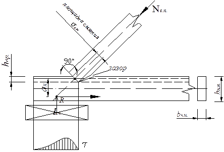 4. lск – длинна площадки скалывания lск ≥ 1,5hн.п.- конструктивное условие lск ≥ 3 eск , 5. eск – эксцентриситет скалывающих сил. Для этого нужно найти центр тяжести ослабленной зоны нижнего пояса. Прикладываем усилие Nн.п. eск – эксцентриситет – это расстояние между центрами тяжести двух площадок: площадок растяжения и площадки скалывания. 6. Максимальная длинна площадки скалывания l maxск = 10 hврубки – это длинна. Которую можно включить в расчет, это разрушения по косослою II-го сорта. 7. Центрирование сил в узле: продолжим ось верхнего пояса до пересечения с горизонтальной линией проходящей через центральную точку ослабленной зоны нижнего пояса – это центр узла, сюда ставим опорную реакцию, здесь должен быть центр опорной подушки. 8. Зазор 2÷3см не должен закрываться при набухании древесины, иначе произойдет разрушение врубки с растяжением поперек волокон, скалывание врубки с отдиранием волокон - эффект рычага.