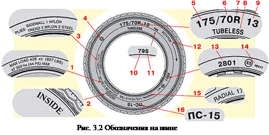 1 – максимальная нагрузка и давление (по стандарту США); - 185; 215; 5,90 – ширина профиля в мм или дюймах; - 70; 90 – серия (отношение высоты профиля к его ширине в процентах; - R – обозначение радиальной шины (в обозначении диагональной шины букву «D» не указывают); - 14; 15; 13 – посадочный диаметр обода в дюймах; - С – индекс, обозначающий, что покрышка предназначена для легких грузовых автомобилей и автобусов особо малой вместимости. - 6,15-13/155-13, где 6,15 и 155 – ширина профиля в дюймах и миллиметрах; 13 – посадочный диаметр обода в дюймах. Если отсутствует буква R, значит шина диагональная. Если не указано значение высоты профиля, оно превышает 80%. - 31х10,5R15 (для шин вседорожников, все размеры в дюймах); - 31 – наружный диаметр; - 10,5 – ширина профиля; - R – радиальная шина; - 15 – посадочный диаметр. Маркировка шин отечественного производства по ГОСТ 4754-97: - товарный знак и (или) наименование изготовителя; - наименование страны – изготовителя на английском языке: «Made in…»; - обозначение конструкции шины; - торговая марка (модель шины); - индекс несущей способности (грузоподъемности); - индекс категории скорости. Таблица 3.4 Таблица индексов скорости и соответствующим им значений