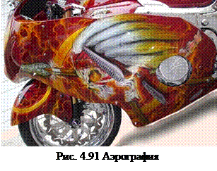 Существует несколько приемов нанесения изображения. Каждый оформитель сам для себя разрабатывает технологические процессы, исходя из личного опыта и эстетических предпочтений. Мотоциклетная аэрография (в особенности при работе с «чопперами» и трайками) несколько отличается, поскольку имеет свои особенности. Изображением приходится привязывать ко всем узлам, а у малогабаритных объемов сложная конфигурация. В остальном, технология аэрографии такая же, как и при оформлении поверхности автомобилей. Перед раскраской мотоцикл проходит аналогичную подготовку. Поверхности матируются нулевой шкуркой, обезжириваются, затем наносится изображение, а после высыхания покрывается защитным лаком и полируется. Работа по оформлению начинается с выбора, понравившегося заказчику, рисунка. Затем эскиз с помощью компьютера накладывается (макетируется) на фотографию автомобиля или другого транспортного средства. Затем виртуальный макет согласовывается с клиентом и передается исполнителю. Классический способ – метод послойного наложения масок (трафаретов). Через эпидиаскоп со слайда на подготовленную, обезжиренную и «заматированную» поверхность обводится контур будущего рисунка. Далее изображение укрывается прозрачной виниловой пленкой. Специальная пленка имеет слабую адгезию (способность прилипать) и, при необходимости, может быть легко удалена. Винил прорезается по контуру нужной зоны и снимается для покраски открытого участка заданным цветом (трафарет). Операция повторяется необходимое количество раз, в зависимости от характера эскиза, причем, каждое предыдущее пятно укрывается после высыхания. Затем изображение полностью освобождается от пленки в границах контура для последующей объемной моделировки формы легким распылом аэрографа. Это самый ответственный этап работы, требующий скрупулезности и навыка. Полученное изображение при необходимости можно снова укрыть, чтобы проработать, например, фон. Окончательно тонкой кистью ретушируются неизбежные огрехи, «затыкаются» непрокрасы и светлыми красками наносятся блики (можно кистью или хорошо настроенным аэрографом). Метод «Свободная кисть» заключаются в рисовании контура тонкой струей аэрографа и ручном нанесении подосновы широким, мягким флейцем. В этом случае отпадает необходимость использования большого количества масок, но желательно, чтобы предназначенные для оформления поверхности были горизонтальными, а работа должна производиться быстросохнущими красками, иначе не избежать подтеков. Нюансы передачи объема моделируются по выше описанной схеме, распылом аэрографа. Такой способ значительно сокращает время, но требует от художника-оформителя соответствующей подготовки и мастерского владения инструментом. Для нанесения подложки удобно использовать ремкомплектные аэрозольные баллоны с краской, которые можно приобрести в любом автомобильном магазине. Выбор цветов – не ограничен. Для аэрографии применяются исключительно качественные материалы и профессиональные инструменты: · эмали, краски, лаки и покрытия · растворители · аэрографы o прямоточный или гравитационный o сифонный или аэрозольный Эмали, краски, лаки и покрытия. Учитывая специфику эксплуатации транспортных средств и влияния агрессивной среды, для раскраски кузовов используются специа