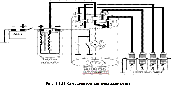 К потребителям электроэнергии можно отнести все электрические и электронные устройства автомобиля. Это: световые приборы, приборы контроля, отопления и вентиляции, звуковая и световая сигнализация, система зажигания, электронные приборы и устройства, обеспечивающие комфортные условия для водителя и пассажиров, различные электроприводы, электронные устройства, обеспечивающие работу систем и агрегатов автомобиля и пр. Одной из основных электронных систем автомобиля, которая наиболее часто подвергаются тюнингу, является система зажигания. Тюнинг системы зажигания предполагает установку бесконтактной или микропроцессорной системы зажигания, модернизацию системы зажигания путем замены или настройки отдельных ее элементов: катушки (катушек) зажигания, устройства управления накоплением и распределением энергии (датчиков, коммутатора, микропроцессорного блока управления), высоковольтных проводов, свечей и пр. Основными типами зажигания в настоящее время являются: контактное, контактно-транзисторное, бесконтактное (электронное), микропроцессорное. Существуют также некоторые другие, не получившие широкого применения типы зажигания, например, бесконтактное с оптическим датчиком, «Михайловское зажигание» и множество приставок типа «Пульсар», «Искра». В каждом зажигании есть свои достоинства и недостатки. Контактная система зажигания (КСЗ). Преимуществами этой системы является предельная простота и надежность. Внезапный отказ маловероятен, ремонт даже в полевых условиях не сложен и займет немного времени. Основных недостатков у этой системы три. Первое - ток подается на первичную обмотку катушки зажигания через контактную группу. Что накладывает существенное ограничение на величину напряжения на вторичной обмотке катушки(до 1.5 кВ), а значит сильно ограничивает энергию искры. Вторым недостатком является высокая потребность в обслуживании этой системы. Т.е. необходимо периодически следить за зазором и состоянием контактной группы. Контакты надо периодически очищать, поскольку они в процессе эксплуатации подгорают. Вал трамблера необходимо после каждых 10 тыс. км. пробега смазывать, капая масло в специальную масленку. Также необходимо смазывать кулачек распределителя посредством смачивания маслом ветрового фальца. Третьим недостатком является низкая эффективность этой системы при высоких оборотах двигателя связанная с т.н. дребезгом контактной группы (Рис. 4.104)