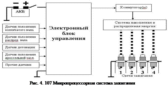 Кроме того систему можно модернизировать посредством использования блока зажигания типа "Пульсар" или "Октан" для БСЗ. Очень важным недостатком обоих вышерассмотренных систем(КСЗ и БСЗ) является то, что обе эти системы не оптимально устанавливают угол опережения зажигания. Начальный уровень опережения зажигания устанавливается вращением трамблера. После этого трамблер жестко фиксируется, а угол соответствует лишь составу рабочей смеси на момент установки этого угла. При изменении параметров топлива, при изменении параметров воздуха, например температуры и давления, результирующие параметры рабочей смеси могут меняться, причем существенно. В результате начальный уровень установки зажигания уже не будет соответствовать параметрам этой смеси. В процессе работы двигателя, для обеспечения оптимального сгорания рабочей смеси, требуется коррекция угла опережения зажигания. Автоматические регуляторы угла опережения зажигания в этих системах, вакуумный и центробежный, достаточно грубые и примитивные устройства, не отличающиеся стабильностью работы. Оптимальная настройка этих устройств не простая задача. Еще одним существенным недостатком КСЗ и БСЗ является наличие электромеханического высоковольтного распределителя (бегунок-крышка трамблера), реализованного с помощью контактного уголька скользящего по вращающейся разностной пластине. Это накладывает дополнительное ограничение на величину высоковольтного напряжения на свечах зажигания, причем это особенно актуально для БСЗ. Микропроцессорная система управления зажиганием. Многие недостатки присущие КСЗ и БСЗ отсутствуют в микропроцессорной системе (рис. 4.107) управления зажиганием (двигателем) (МПСЗ, МСУД).