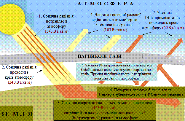 Рис. 2.2. Класифікація природних ресурсів Середня солоність Світового океану близько 35 °/оо, тобто в кожному кілограмі води міститься в середньому 35 г солей. Звичайно води суходолу слабко мінералізовані – прісні (солоність рік і прісних озер від 0,5 до 1 °/оо. Відомі водойми, вміст солей у яких є майже таким, як у дистильованій воді (це, зокрема, сфагнові болота; солоність становить не більше 0,01 °/оо). Середня солоність океанічної води близько 35 °/оо, солоність морської води коливається від 1-2 °/оо (Фінська затока Балтійського моря) до 41,5 °/оо (Червоне море). Найбільша концентрація солей природних водойм – у солоних озерах (Мертве море до 260 °/оо) і Тамбуканському озері на Кавказі (347 °/оо). Дві крайні величини солоності – 0,010 °/оо та 347 °/оо визначають діапазон солоності природних водойм, у межах якого можливе життя. Природні ресурси – це найважливіші компоненти навколишнього природного середовища, які використовують для задоволення матеріальних і культурних потреб людини. Вони поділяються на невичерпні і вичерпні (рис.2.2). Біосфера землі є замкненою системою з відносно сталою масою і обмінюється з космічним простором лише енергією. Тому людству необхідно враховувати її здатність до само відтворення своєї біопродуктивності та вичерпність запасів невідновних ресурсів. Потрібно економно і раціонально використовувати природні ресурси, свідомо відмовляючись від надлишків. Подальший розвиток життя на Землі залежить від наявності природних ресурсів, простору для життя і об’єктів для задоволення культурних та інших потреб. Форми та механізми деградації біосфери. Антропогенне забруднення атмосфери. Існує два головних джерела забруднення атмосфери: природне і антропогенне. Природне джерело – це вулкани, пилові бурі, лісові пожежі, процеси розкладання рослин і тварин. До основних антропогенних джерел забруднення атмосфери належать підприємства паливно-енергетичного комплексу, промислові підприємства і транспорт. Сучасний розвиток людського суспільства характеризується надзвичайно інтенсивним зростанням чисельності населення, а, отже, й зростанням енергетичних потреб. Упродовж XX ст. з надр Землі видобуто корисних копалин більше, ніж за всю попередню історію людства. Внаслідок їхнього використання відбувається викидання в атмосферу великої кількості шкідливих газів (сірчаний ангідрид, оксид сірки, оксиди азоту, вуглеводні, сажа, яка є носієм смолистих речовин, пил і зола, які містять солі важких металів) в атмосферу. Результатом цього є парниковий ефект та глобальне потепління, випадання кислотних опадів, утворення озонових дір, виникнення смогів. Парниковий ефект. Температура на Землі підтримується завдяки балансу між нагріванням Землі сонячним промінням та охолодженням після повернення енергії в космос. Підтримання енергетичного балансу відбувається завдяки так званим парниковим газам. Ці гази функціонують так, як скло в теплицях: дають можливість інфрачервоним променям потрапляти всередину і затримують їх, забезпечуючи стабільну температуру (рис.2.3). Існує 6 основних парникових газів: · вуглекислий газ CO2. Його внесок у парниковий ефект становить понад 50%. Збільшення концентрації CO2відбувається внаслідок знищення лісів (щороку в світі знищується від 16 до 20 млн. га лісів. Наявна на сьогодні фітомаса планети здатна поглин