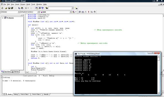 cout <<"\nMax="<<max<<setw(10)<<"i="<<imax; cout <<"\nMin="<<min<<setw(10)<<"i="<<imin<<endl; return 0; } // Функция поиска минимального и максимального элементов // одномерного массива и их индексов void MinMax (int a[],int n,int *min,int *max,int *imin,int *imax) { int i; *min=*max=a[0]; // Инициализация значений *imin=*imax=0; for (i=1; i<n; i++) { if (a[i]<*min) { // Поиск минимального элемента и его индекса *min=a[i]; *imin = i; } if (a[i]>*max) { // Поиск максимального элемента и его индекса *max=a[i]; *imax = i; } } }