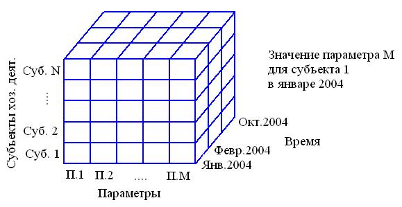 Модели данных, используемые для построения ХДКритерием эффективности для систем операционной обработки данных служит число транзакций, которое они способны выполнить в единицу времени. Для аналитических систем важнее скорость выполнения сложных запросов и прозрачность структуры хранения информации для пользователей. Важная особенность СППР на основе ХД состоит в том, что загрузка данных выполняется сравнительно редко, но большими порциями (до нескольких млн. за 1 раз). Существует 2 подхода к построению ХД: - Использование многомерной модели БД; - Использование реляционной модели БД. В чем-то конкурирующих, а в чем-то дополняющих друг-друга подхода. Например, пусть требуется создать хранилище, накапливающее информацию об изменении социально-экономической обстановке в стране. Она характеризуется многими параметрами, в числе которых: объем промышленного производства, индекс потребительских цен и т.д. Госкомстат собирает их значения для различных субъектов помесячно, поквартально, за год. В хранилище попадают, ПАРАМЕТР в СУБЪЕКТЕ в МОМЕНТ ВРЕМЕНИ был равен {значение} например индекс цен в г. Киеве в 2004 г. в декабре = 101%. В рассмотренном примере каждое значение связано с точкой в трехмерном пространстве (N, S, T). Числа N, S и T конечны, потому все значения можно представить в виде гиперкуба: 1) MOLAP – Использование такой модели позволяет резко уменьшить время поиска информации ~ в 10 – 100 раз меньше, чем для реляционной СУБД. В реальной задаче число измерений может быть больше. Основные понятия многомерной модели – измерение и значение(ячейка). Измерение – множество, образующее одну из граней куба. Значение – это подвергаемые анализу количественные или качественные данные, которые находятся в ячейках гиперкуба. Многомерные СУБД лучше справляются с задачами выполнения сложных нерегламентированных запросов. Но недостатки: неэффективно используют память, т.к. заранее резервируется место для всех значений, даже если часть их будет заведомо отсутствовать. Выбор высокого уровня детализации очень сильно увеличивает объем БД. Допустимо на сегодня 10 – 20 гигабайт.