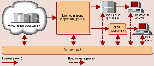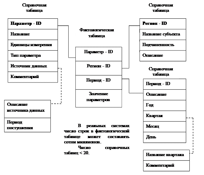 Рисунок 10.3 – Реляционная модель данных Метаданные являются важнейшей составной частью ХД. Пользователь не сможет извлечь нужные данные из хранилища, если не будет знать, что там находится. Прежде, чем сформулировать запрос к системе, аналитик должен понять, какая информация в ней имеется, насколько она актуальна, точна, а также сколько времени может занять ожидание ответа. Метаданные это информация о структуре, размещении и трансформации данных. Благодаря метаданным обеспечивается эффективное взаимодействие различных компонентов хранилища. Метаданные – это высокоуровневые средства отражения информационной модели СППР. Для обеспечения удобства доступа пользователей к информационной модели ХД метаданные должны содержать: описание структур данных хранилища, структур данных, импортируемых из разных источников, сведения периодичности импортирования, методах загрузки и обобщения данных, средствах доступа и правилах представления информации, оценка приблизительных затрат времени на получение ответа. Метаданные помещаются в „репозитарий метаданных”. Существует стандарт обмена метаданными MDIS, обеспечивающий возможность интеграции средств разных производителей друг с другом.