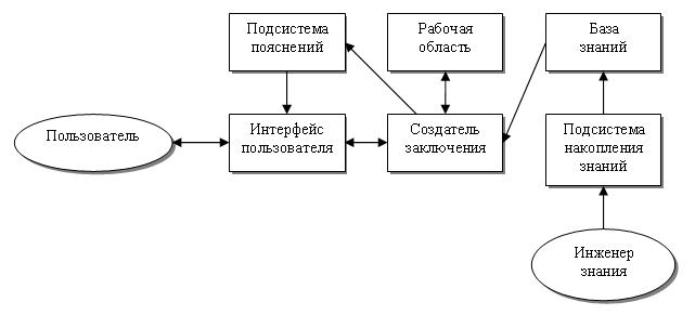 Рисунок 12.1 – Архитектура экспертной системы Чтобы спроектировать экспертную систему, специалист, называемый инженером знания, очень тесно работает с одним или большим количеством экспертов в изучаемой области. Инженеры знания пробуют узнавать все относительно способа, которым эксперт принимает решения. Знание, полученное инженером знания, затем загружается в компьютерную систему, в базу знаний (рис. 12.1). Эта база знаний содержит правила и заключения, которые используются в принятии решений, - параметры, или факты, необходимые для решения. Другие главные фрагменты экспертной системы это – · создатель заключения - логический каркас, который автоматически проводит линию рассуждения; · интерфейс пользователя - блок, используемый конечным пользователем; · подсистема объяснения - чтобы разъяснять доводы, что система движется в направлении решения; · подсистема накопления знания - чтобы помочь инженеру знания в регистрации правил заключения и параметров в базе знаний; · рабочая область - чтобы использовать компьютер, поскольку решение сделано. База знаний – совокупность сведений о предметной области. Знания 1 рода – общеизвестные факты, явления, закономерности данной области. Знания 2 года – набор эмпирических правил и интуитивных выводов, которыми пользуются специалисты в условиях неопределенности и противоречивости. В БЗ преимущественно знания 1 рода. Инженер по знаниям записывает значения, поданные экспертами, в БЗ. Все знания в БЗ делятся на интенсиональные или абстрактные, которые представляют собой понятийные (концептуальные) знания про объекты предметной области и связи между ними. Виды знаний. Знания это – „Основные закономерности предметной области, позволяющие человеку решать конкретные производственные, научные и другие задачи, т.е. факты, понятия, взаимосвязь, оценка, правила, эвристика – фактические знания, а также стратегии принятия решений в этой области – стратегические знания. Знания разделяют также на 2 большие категории – факты и эвристика. Факты – хорошо известные в той или иной области обстоятельства. Такие знания еще называются текстовыми, имея в виду достаточную их освещенность в специальной литературе. Эвристика основана на индивидуальном опыте специалиста в предметной области, накопленном в результате многолетней практике. Сюда относятся такие знания, как „способы удаления бесполезных гипотез”, „способы использования нечеткой информации”, „способы разрешения противоречий”. Интенсиональные знания – это знания о связях между атрибутами (признаками) объектов данной предметной области. Они оперируют абстрактными объектами, событиями и отношениями. Экстенсиональные знания – данные об объектах, количественная характеристика, значения параметров в пространстве и времени. Знания делят также на глубинные и поверхностные. В глубинных знаниях отражается понимание структуры предметной области, назначение и взаимосвязь отдельных понятий. (в фундаментальной науке – это законы и теоретические основания). Поверхностные знания обычно касаются внешних эмпирических ассоциаций с каким-либо феноменом предметной области. Например, для разговора по телефону требуются лишь поверхностные знания о … Большинство экспертных систем основано на применении поверхностных знаний. Это, однако, неред