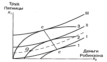 Геометрическое место точек касания кривых безразличия Эр орт назвал «контрактной кривой» (СС). Эти точки предпочтительнее всех остальных потому, что в любой из других точек один из участии ков обмена может улучшить свое положение, не ухудшая положении другого. (Из точки Q,, не лежащей на контрактной кривой, можно по кривой 2 переместиться в точку на кривой СС с выигрышем дляРобинзона и без потерь для Пятницы.) Таким образом, при изолированном обмене все точки контрактной кривой являются равновесными (позднее они были названы оптимальными по Парето), и мы не можем заранее определить, какая из них будет достигнута: это за висит от того, насколько искусно будет вести торг каждая сторона и какая цена будет предложена как «стартовая». При наличии большего числа участников рынка становится возможен арбитраж (один из «Пятниц», недовольный оплатой своего труда, может пойти к другому «Робинзону»). Это приведет к ценовой конкуренции, и некоторые точки на контрактной кривой станут недостижимыми (набор возможных состояний равновесия сузится). В пределе, при множестве продавцов и покупателей цена будет стремиться к одной точке, соответствующей совершенной конкуренции. В случае совершенной конкуренции, когда число продавцов и покупателей бесконечно, равновесие обмена является определенным - в этом смысл так называемой предельной теоремы Эджуорта. Рекомендуемая литература Джевонс У.С. Об общей математической теории политической экономии. Краткое сообщение об общей математической теории политической экономии // Теория потребительского поведения и спроса. Серия «Вехи экономической мысли». Вып. 1/ Под ред. В.М. Гальперина. СПб.: Экономическая школа, 1993. С. 67-77. Блауг М. Экономическая мысль в ретроспективе. М.: Дело, 1994. С. 288-295. Негиши Т. История экономической теории. М.: Аспект-пресс, 1995. С.373-398. Глава 13
