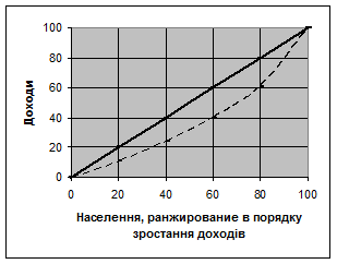 Диференціація доходів визначається рівнем розвитку продуктивних сил і суспільних відносин і залежить від економічних, демографічних і соціальних факторів. Диференціацію доходів можна наочно показати через співвідношення рівнів матеріальної забезпеченості - 10 % найбільш і 10 % найменш забезпечених груп населення (доцільний коефіцієнт). В Україні це співвідношення становило в 1992 році 1: 7,5-8, а в 2001 році – 1: 13,5. Рівень диференціації грошових доходів населення вимірюється різними способами: графічним (гістограми) статистичними (коефіцієнт варіації), децильний, квінтильний або квартильний фондовий індекс та інші. Більш складний спосіб аналізу диференціації доходів населення - рахунок накопичуваних або кумулятивних частот і побудова кумулятивних кривих або кривих Лоренца (рис.4.1.). Для побудови кривої Лоренца на осях координат з процентною шкалою від 0 до 100 відкладаються кумулятивні результати розподілів: на горизонтальній осі – квінтилі осіб, що отримують дохід, на вертикальній - квінтилі отриманих доходів. Крива Лоренца будується сполученням точок, що відповідають кумулятивним відсотковим часткам доходу, отриманих квінтильними групами населення. За рівномірного розподілу доходів кожна 20-відсоткова група населення мала б п’яту частину доходів суспільства. На графіку це зображається діагоналлю квадрата і є лінією рівномірного розподілу. За нерівномірного розподілу «лінія концентрації» являє собою угнуту вниз криву. Чим більше відхилення кривої Лоренца від діагоналі квадрата, тим не рівномірніше розподілені доходи в суспільстві.
