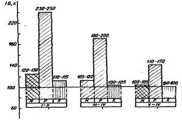 Найголовніша вимога до застосування добрив - нормування агрохімічних засобів в межах потенціалу самовідновної здатності агроекосистем. Отже, система удобрення сільськогосподарських культур в адаптивному землеробстві має грунтуватися на екологічних законах та принципі "розумної достатності". Вона повинна забезпечувати не тільки біодинамічну рівновагу СЗ, одержання врожаїв екологічно доцільної кількості та якості, а й стійке стабільне функціонування АЕС, максимально сприяти зберіганню таких їх важливих властивостей, як замкненість, саморегулювання та здатність до самовідновлення без шкоди для навколишнього середовища. Оскільки система удобрення повинна бути енерго- та ресурсозберігаючою, то нормування агрохімічних засобів слід проводити на біоенергетичній основі, спираючись на закони Природи про збереження і перетворення енергії та речовин. До застосування азотних добрив треба ставитися обережно, дотримуючись регламентів. Найголовніший з них - екологічно небезпечний показник інтенсивності балансу (ІБ). За даними вчених для азоту ІБ не може перевищувати 105-110 % при веденні землеробства на дерново-підзолистих і сірих лісових грунтах і 70-100 % - в зоні чорноземів. Що стосується фосфорних і калійних добрив, то для них цей показник варіює в залежності від вмісту в грунті рухомого фосфору і обмінного калію (рис. 14.12).
