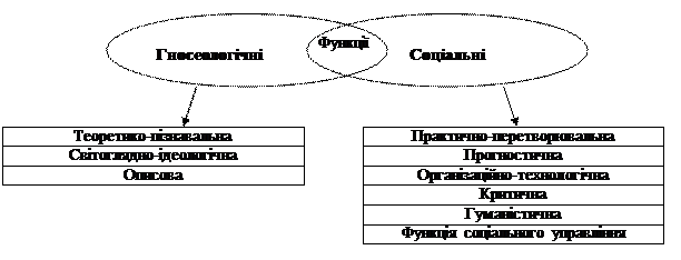 Теоретико-пізнавальна – вивчення та пізнання суспільства, пояснення, поповнення та збагачення існуючого соціологічного знання, розробка законів та категорій. Описова функція – систематизація, опис, нагромадження отриманого дослідницького матеріалу у вигляді наукових звітів, статей. Інформаційна функція – збір, систематизація та нагромадження соціологічної інформації, отриманої в результаті проведення соціологічних досліджень. Прогностична функція – надання на основі проведених соціологічних досліджень короткострокових або довгострокових соціальних прогнозів. Управлінська функція – сприяння вдосконаленню соціальних процесів. Ідеологічна (світоглядна) – розширення світогляду людини, сприяння формуванню світогляду. Соціологія в системі суспільних наук