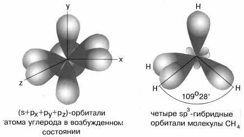 Рис.5 sp3-гибридизация Если все гибридные орбитали связаны с одинаковыми атомами, то связи ничем не отличаются друг от друга. В других случаях встречаются небольшие отклонения от стандартных валентных углов. Например, в молекуле воды H2O кислород - sp3-гибридный, находится в центре неправильного тетраэдра, в вершины которого "смотрят" два атома водорода и две неподеленные пары электронов (рис. 2). Форма молекулы угловая, если смотреть по центрам атомов. Валентный угол HОН составляет 105о, что довольно близко к теоретическому значению 109о.
