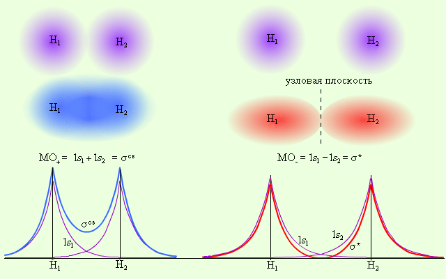 Далее мысленно перекроем две атомные орбитали, образовав две молекулярные, одна из которых (связывающая) обладает меньшей энергией (расположена ниже), а вторая (разрыхляющая) – большей энергией (расположена выше).