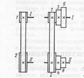 Изменять скорость вращения валов с помощью сменных колес целесообразно при длительной работе станка без перенастройки, так как замена колес требует много времени. Широкое распространение получили механизмы, состоящие из передвижных многовенцовых блоков зубчатых колес (рисунок 3). Количество колес в блоке чаще всего два, три и реже четыре. При переключении колеса блока перемещаются на шлицах вдоль оси вала и поочередно входят в зацепление с сопряженными колесами. Основное достоинство механизмов с передвижными блоками – их простота. К числу недостатков следует отнести невозможность переключения передачи на ходу и сравнительно большие габаритные размеры (см. рисунок 3). Механизмы, у которых зубчатые колеса находятся в постоянном зацеплении (рисунок 4), не имеют этих недостатков. На одном валу 1 закреплены колеса 1 и 3, на другом 11 насажены свободно колеса 2 и 4. Ту или иную передачу включают в работу муфтой 5. Ее ведущий элемент связан с колесами 2 и 4, ведомый – с валом 11. Если муфта фрикционного типа, то возможно переключение на ходу.