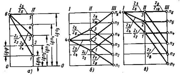 Передачи условно изображают прямыми линиями (например, 6-5, 6-3, 6-1). Концы линий соединяют с точками, соответствующими числам оборотов ведущего и ведомого валов. Линия 6-1, например, изображает зубчатую передачу Линии с наклоном вверх (слева направо) изображают ускорительную передачу, а направленные вниз – замедлительную передачу. Передаточное отношение передачи I = φ±s, где s – число интервалов lgφ, на которое поднимается или опускается линия, изображающая передачу. Для ускорительной передачи s имеет положительное значение, для замедлительной – отрицательное. Пусть линии 6-1, 6-3, 6-5 (рисунок 6,а) изображают группу передач с трехвенцовым передвижным блоком (например, 1-2, 3-4, 5-6, рисунок 5,а). Тогда передаточные отношения передач по графику
