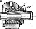 6.1 Обычные конструкции подшипников скольжения шпинделей. При износе и при сильном изменении режима работы станка должна быть возможность регулирования зазора между шейкой шпинделя и подшипником. Желательно, чтобы при регулировании не было искажения формы подшипника, так как это может повлиять на условия жидкостного трения и точность его вращения. Шейка шпинделя и соответственно сопряженная поверхность подшипника могут быть цилиндрической или конической. Технологически проще изготовить точную цилиндрическую шейку шпинделя, однако при конической шейке можно обеспечить регулирование зазора без искажения сопряженных поверхностей. Конструкция подшипника проста, но, во-первых, его регулирование занимает много времени и требует разборки подшипника и, во-вторых, искажается внутренняя цилиндрическая форма подшипника. Разъемы могут мешать образованию масляного клина. Такие подшипники применяются в некоторых конструкциях тяжелых станков. У подшипника с прорезью и конической наружной поверхностью (рисунок 7,а) можно регулировать зазор без его разборки. Для этого предусмотрены две гайки, которые втягивают подшипник в конусную расточку корпуса, благодаря чему он будет более плотно охватывать вал. Хотя такая конструкция и удобна в эксплуатации, здесь также происходит искажение формы зазора. В подшипниках скольжения с конической шейкой шпинделя (рисунок 7,б) регулирование зазора происходит без искажения его формы за счет осевого смещения подшипника. Такая конструкция применяется в ряде токарных станков средних размеров. В небольших прецизионных станках применяются конструкции подшипника скольжения с конической поверхностью и дополнительным буртиком, воспринимающим часть осевых усилий (рисунок 7,в). Недостатком шпинделей с конической шейкой заключается в большей сложности изготовления точных поверхностей подшипника и шейки. Во всех конструкциях должна быть обеспечена надежная смазка подшипника, лучше с циркуляцией масла для его охлаждения и фильтрации.