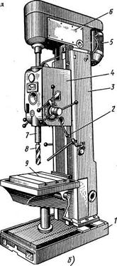 9.1 Вертикально-сверлильные станки. Общий вид наиболее распространенного универсального одношпиндельного вертикально-сверлильного станка показан на рисунке 20. Станок предназначен для работы в основных производственных цехах, а также в условиях единичного и мелкосерийного производства в ремонтно-механических и инструментальных цехах.