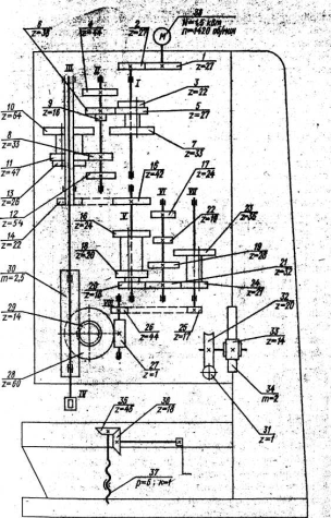 На фундаментной плите 1 смонтирована колонна 2 коробчатой формы. В ее верхней части размещена шпиндельная головка 3, несущая электродвигатель 4 и шпиндель 5 с инструментом 6. На вертикальных направляющих колонны установлена шпиндельная бабка 7, внутри которой размещен механизм подачи, осуществляющий вертикальное перемещение шпинделя. Поднимать и опускать шпиндель можно механически с помощью штурвала 8 вручную. Для установки и закрепления приспособления с обрабатываемыми заготовками имеется стол 9. Его можно установить на различной высоте в зависимости от размеров обрабатываемых деталей. На рисунке 21 представлена кинематическая схема вертикально-сверлильного станка 2Н118. Частота вращения шпинделя изменяется с помощью коробки скоростей. Приемный вал 1 вращается от электродвигателя 38 через передачу 1-2. Движение валу 11 сообщает одна из трех пар зубчатых колес: 3-4, 5-6 и 7-8. Дальнейшее вращение передается одной из кинематических цепей 9-10, 8-11 или 12-13. Конечный вал 111 коробки скоростей представляет собой полую гильзу, шлицевое отверстие которой передает вращение шпинделю 1V. В итоге шпиндель имеет девять различных частот вращения.
