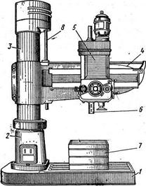 Обрабатываемые детали устанавливают на столе 7 или непосредственно на верхней плоскости фундаментной плиты. Шпиндель 6 со сверлильной головкой может перемещаться в горизонтальном направлении, а вместе с траверсой 4 и гильзой 3 поворачиваться вокруг оси неподвижной колонны. Эти два движения обеспечивают установку инструмента по любым координатам. С помощью винта 8 траверса понимается или опускается по гильзе и закрепляется на любой высоте. Гильза, в свою очередь, может быть зажата на колонне, а сверлильная головка – на траверсе. Перед сверлением отверстия гильзу и сверлильную головку фиксируют, а по окончании обработки освобождают. Механизмы зажима размещены в нижней части гильзы, над тумбой 2 и в сверлильной головке 5.