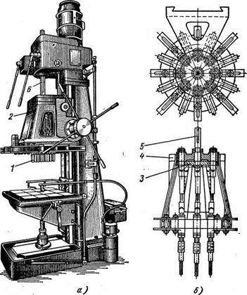 9.3 Многошпиндельные сверлильные станки и головки. Для одновременного сверления нескольких отверстий применяют многошпиндельные станки и головки. В машиностроении нашли распространение два вида многошпиндельных головок: для оснащения универсальных вертикально-сверлильных станков и для агрегатных станков.