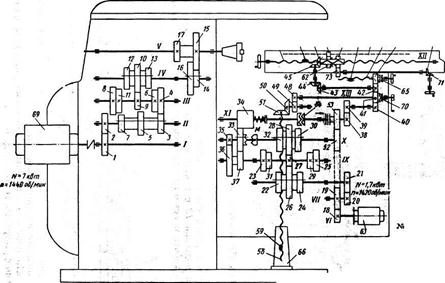 10 Фрезерные станки 10.1 Горизонтально-фрезерные станки. На рисунке 24 показана кинематическая схема универсального горизонтально-фрезерного станка мод. 6М82. Привод главного движения получает начало от электродвигателя 69 и осуществляется 18-ступенчатой коробкой скоростей. Вращение от вала 1 с помощью зубчатых колес 1-2 передается валу 11, и далее через одну из трех пар колес (3-4, 5-6 или 7-8) сообщает движение валу 1V, а последний по цепи колес 14-15 или 16-17 – шпинделю V. Изменение скоростей достигают переключением колес 3-5-7, 10-13-12 и 14-16. Привод механизма подачи расположен внутри консоли. Электродвигатель 63 с помощью передач 18-19, 20-21 вращает вал V111, и далее через зубчатые колеса 22-23, 24-25 или 26-27 вращение передается валу 1Х. С вала 1Х через зубчатые колеса 27-28, 29-30 или 31-32 вращение передается валу Х. Отсюда движение на вал Х1 может быть передано через пару колес 33-34 (колесо 33 смещается вправо для сцепления с муфтой М), или через перебор, состоящий из колес 35-36, 37-33 и 33-34 (при этом колесо 33 занимает положение, показанное на схеме). Широкое колесо 34 свободно насажено на вал и передает ему вращение при включении муфты 64. При включении дисковой фрикционной муфты М вал Х1 может получить быстрое вращение, необходимое для осуществления ускоренных ходов. Цепь быстрого вращения состоит из группы передач 18-19, 19-52 и 52-53. Муфты 67 и 64 сблокированы и имеют один орган управления: при включении первой муфты вторая выключается и наоборот. Подача стола осуществляется с помощью винтовых механизмов: продольная – парой 54-55; поперечная 56-57 и вертикальная 58-59. Цепь продольной подачи соединяет вал Х1 с ходовым винтом 54. Она состоит из передач 38-39, 40-42, 43-44, 45-46 (на схеме винт 54 повернут на 900 относительно оси колес 44 и 45; его ость перпендикулярна плоскости чертежа). Цепь поперечной подачи состоит из зубчатых колес 38-39, 40-42-47.