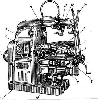 10.2 Вертикально-фрезерные станки. Станки этой группы строятся обычно на одной базе с горизонтально-фрезерными и поэтому имеют много унифицированных узлов и деталей. Данный станок отличается вертикальным расположением оси шпинделя, в связи с чем изменена конструкция станины и шпиндельного узла. Внешний вид станка показан на рисунке 25.