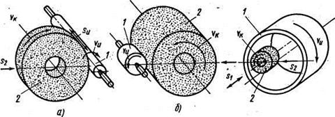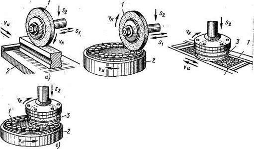 В процессе круглого шлифования (рисунок 28,а) заготовка 1 получает круговую Vи и продольную Sи подачи; последняя обеспечивает возвратно-поступательное движение стола, на котором в центрах установлена заготовка. В конце каждого одинарного или двойного хода стола шлифовальному кругу 2 сообщается поперечная подача S2. Таким образом, припуск снимается за несколько рабочих ходов. На рисунке 28,б показана схема круглого шлифования коротких деталей с применением только радиальной подачи (врезное шлифование), а на рисунке,в – схема внутреннего шлифования. В последнем случае заготовка 1 вращается со скоростью круговой подачи Vи, а шлифовальный круг 2 имеет осевую подачу S1 в обе стороны и радиальное перемещение S2 при врезании. При плоском шлифовании (рисунок 29) детали устанавливают на прямоугольном или круглом магнитном столе. Шлифовальный круг работает своей периферией или торцом. В первом случае (рисунок 29,а) столу 2 сообщают возвратно-поступательное движение Vи, а кругу 1 – поперечную подачу S1 за каждый ход стола. После прохода всей плоскости круг получает вертикальную подачу S2 на глубину шлифования. Если стол круглый (рисунок 29, б), его вращение выполняет круговую подачу. При шлифовании торцом круга (рисунок 29,в) детали 1 устанавливают на магнитном столе 2, которому сообщают возвратно-поступательное движение со скоростью Vи. Шлифовальный круг 3 перекрывает ширину стола и поэтому шлифует деталь (или группу деталей) по всей ширине за несколько проходов. Круг периодически получает вертикальную подачу S2. В других плоскошлифовальных станках (рисунок 30,г) детали 1 устанавливают на круглом столе 2, которому сообщают вращение (круговую подачу). Круг 3, перекрывая часть стола, обеспечивает шлифование по всей ширине только группы деталей.