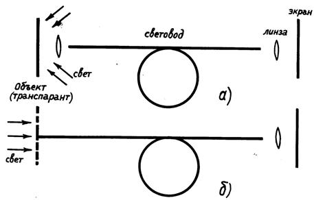 Рис. 8.10. Демонстрация работы световодного жгута. Изображение объекта строится на выходном торце световодного жгута либо с помощью короткофокусного объектива (рис. 8.10 а), либо путем непосредственного контакта выходного торца с прозрачным объектом (рис. 8.10 б). При этом отдельные световоды жгута оказываются освещенными неодинаково в соответствии с распределением интенсивности света в изображении объекта. Это неоднородное распределение интенсивности на входном торце жгута полностью воспроизводится на его выходном торце и визуализируется либо непосредственно глазом, либо с помощью линзы (микроскопа). Достоинствами такого способа передачи изображения (по сравнению с обычным способ, использующим линзы) являются высокая яркость изображения (обусловленная тем, что световод «захватывает» значительно бóльшую часть света, отраженного объектом) и возможность получения изображения в любом месте пространства (обеспечиваемая гибкостью световодного жгута). Конечно, разрешающая способность таких жгутов, определяемая количеством отдельных световодов, значительно меньше, чем линзовых систем для построения изображений, где определяющим фактором является дифракция на апертуре линзы. Однако указанные выше достоинства делают волконно-оптические способы передачи изображений более эффективными, особенно в медицине (эндоскопы), приборостроении (волоконно-оптические экраны к электронно-лучевым трубкам, электронно-оптическим преобразователям и т. п.), фотографии и кинематографии (копировальные устройства) и других областях техники. Лекционная демонстрация работы многожильных световодов (световодных жгутов) проводится в два этапа. Сначала исследуется многожильный световод, состоящий из небольшого (16) числа сравнительно толстых световодов. Входной торец такого световода неоднородно освещается лампочкой накаливания, а распределение интенсивности на выходном торце визуализируется с помощью микроскопа и сопряженной с ним телевизионной камеры (рис. 8.11).