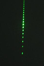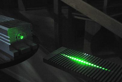 видим, что отклонения дифрагированных максимумов от Для демонстрации берем рейку от зубчатой передачи (кремальеры) и освещаем ее излучением лазера (в данном случае удобен зеленый лазер мощностью около 20 мВт). На рис. 8.36 хорошо видна геометрия взаимного расположения лазера и рейки.