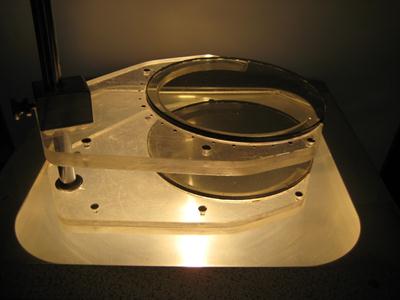 где I0 – интенсивность линейно поляризованного света, падающего на анализатор. Для демонстрации этого эффекта используется специальная «двухъярусная» оправка из оргстекла, на которую помещаются два дихроичных поляризатора достаточно большого размера (рис. 8.53)[22]. Каждый поляризатор можно независимо вращать вокруг вертикальной оси. Оправка с поляризаторами помещается на кодоскоп, с помощью которого изображения поверхностей поляризаторов проецируются на экран или на стену аудитории.