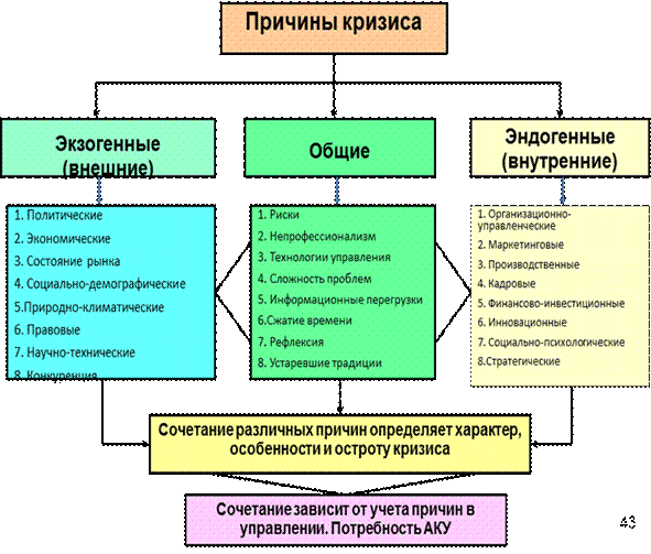 Рисунок – Причины кризиса Внешние причины. Экономическая политика. Нехватка государственных средств для решения общегосударственных задач. Правительство пытается сгладить последствия ухудшения экономической ситуации регулированием налогов, денежной массы, ставки банковского процента. Кризисные факторы – ужесточение налогообложения: отмена налоговых льгот, отмена намеченных реструктуризацией налоговых платежей; рост отдельных ставок налогов или увеличение уровня налогообложения в целом; удорожание кредита, прекращение государственного льготного кредитования. Последствия для организации – рост издержек и цен на продукцию, снижение продаж, оборота, выручки. Политика государства. Государство вводит дополнительные запреты или ограничения на отдельные виды предпринимательской деятельности; нестабильность в правительстве, связанная с частой ротацией министров и ключевых чиновников, а также частая смена правительственного курса или неопределенность в экономической сфере. Последствия – ухудшение инвестиционного климата (опасение вкладывать средства в развитие производства из-за высокого риска утраты этих средств), развитие у бизнесменов синдрома «временщиков», прекращение ими работы на перспективу; вывоз капитала из страны. Социальные причины – традиции, жизненные ценности и установки, приверженность к административно-плановой экономике, низкий уровень производственной культуры, отсутствие навыков управления в рыночных условиях. Последствия – некачественный менеджмент, отвлечение средств в непроизводственную сферу, тяга к расточительству, преступность, коррупция. Технологические причины – низкий общий технический уровень, недостаточное финансирование государством науки и новых технических разработок при открытости рынка для зарубежных производителей. Последствия – технологическая отсталость; низкий уровень производительности труда; низкое качество и высокая себестоимость продукции; неконкурентоспособность. Правовые причины. Проявления – недостаточное антимонопольное регулирование, которое проявляется в высокой степени монополизации и массовом применении в деловом обороте методов и способов недобросовестной конкуренции; низкий уровень правопорядка (тотальное несоблюдение законодательных актов «сверху до низу»). Последствия – произвольное повышение организациями-монополистами цен на продукцию за счет остальных субъектов, нестабильность деятельности, отсутствие желания производить вложения в производственную собственность ввиду высокого риска ее утраты из-за неправомерных действий конкурентов и иных лиц и ввиду неэффективной правоохранительной и судебной системы, которая не позволяет быстро и в полном объеме восстанавливать нарушенные права. Маркетинговые причины. Вынужденная (технологическая) зависимость от потребителей и поставщиков. Проявление – затоваривание, задержки поставок сырья или продукции. Последствия – нарушение ритмичности работы, снижение объема производства и качества продукции, невыполнение обязательств перед контрагентами, отсутствие роста выручки или существенное замедление роста выручки, рост неплатежей. Внутренние причины. Управленческие – высокий уровень коммерческого риска, недостаточное знание конъюнктуры рынка, неэффективный финансов
