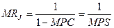 Предположим, что предприниматель решил вложить 100 млн.руб в совершенствование производства. Он закупил новое оборудование, нанял дополнительных работников. В результате его поставщики и работники получили дополнительный доход, равный 100 млн.руб. Пусть предельная склонность к потреблению MPC=0.8 – постоянна, т.е. поставщики и работники из полученного дополнительного дохода 100 млн.руб израсходовали 80 млн.руб, увеличив доход какого – то другого на эту сумму. Вторые получатели израсходуют уже 64 млн. (0,8*80млн.руб), сформировав доход 3-х лиц на уровне 64 млн.руб, и т.д. Т.о. исходные 100 млн.руб вызвали бесконечную цепь вторичных потребительских расходов, увеличивая совокупные доходы (0,8+ (0,8)2+…) – сумма геометрической прогрессии, которая равняется (1/(1-0,8))=5, или в общем виде