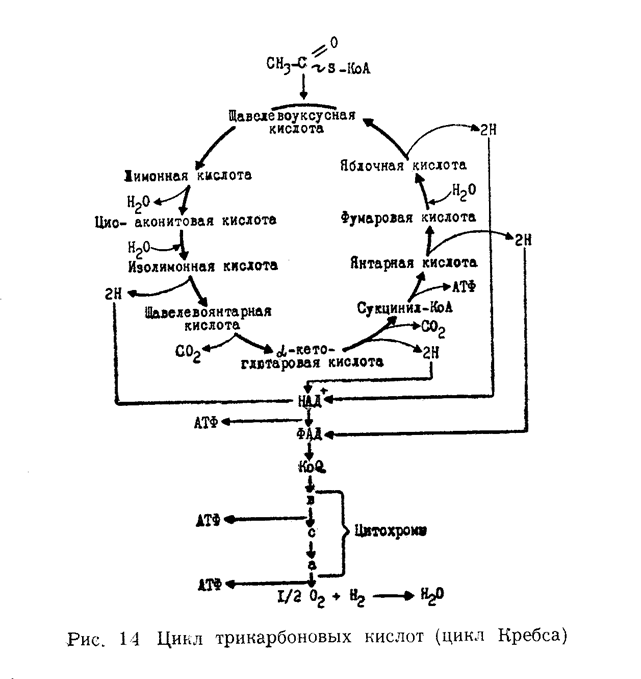 Следующий этап непрямого аэробного окисления глюкозы характеризуется полным окислением ацетил-КоА в цикле Кребса до СО2 и Н2О. ЦИКЛ ДИ- и ТРИКАРБОНОВЫХ КИСЛОТ (КРЕБСА). Исследования показали, что дальнейшее окисление ацетил-КоА возможно лишь в присутствии небольших количеств какой-либо ди-карбоновой кислоты. Оказалось, что в начале ацетил-коэнзима А конденсируется с щавелевоуксусной кислотой (СООН—СН2— СО—СООН) с образованием лимонной (трикарбоновой) кислоты. Лимонная кислота является первым продуктом цикла Кребса, поэтому этот цикл иногда называют лимоннокислым. Образовавшаяся лимонная кислота подвергается далее ряду сложных превращений. И прежде всего, дегидратированию с образованием цис-аконитовой кислоты. Последняя присоединяет молекулу воды и переходит в изолимонную кислоту. Изолимонная кислота подвергается дегидрированию и превращается в щавелево-янтарную, которая декарбоксилируется с образованием µ-кетоглютаровой. µ-Кетоглютаровая кислота подвергается окислительному декарбоксилированию и одновременно дегидрируется, переходя в сукцинил-КоА. Затем сукцинил-КоА превращается в янтарную кислоту. Янтарная кислота дегидрируется, превращаясь в фумаровую. Фумаровая переходит в яблочную, а из яблочной при ее дегидрировании образуется щавелевоуксусная. На этом цикл замыкается. Многие реакции цикла Кребса легко обратимы. Ферменты, катализирующие реакции цикла Кребса