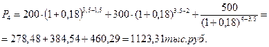 Согласно контракту предприятие должно выплатить 200, 300 и 500 тыс. рублей соответственно через 1,5 года, 2 и 4 года. Предприятие предлагает пересмотреть контракт и вернуть долг одним платежом через 3,5 года. Найдите величину консолидированного платежа, если применяется сложная процентная ставка 18% годовых. Решение: