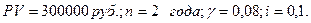 Инфляция уменьшает реальную ставку процента. В результате реальная ставка процентов составит Замечание. При невысокой инфляции величины Пример. Кредит в 300000 рублей выдается на 2 года. Прогнозируемый уровень инфляции на этот период 8% в год. Проценты сложные. Какую процентную ставку должен назначить банк, чтобы обеспечить реальную доходность кредитной операции 10% годовых. Определите наращенную сумму долга. Решение: